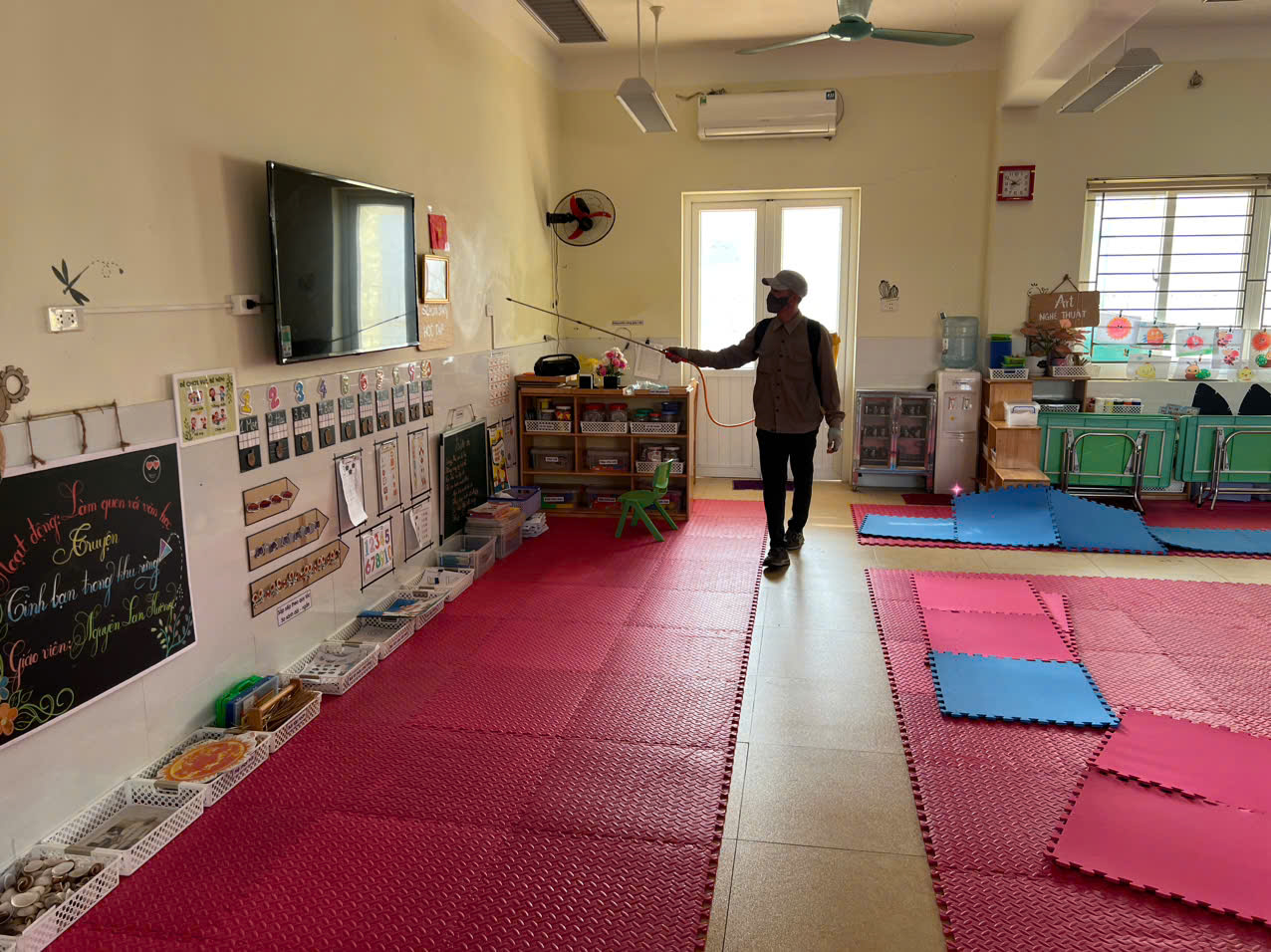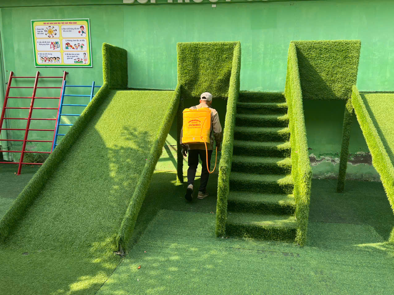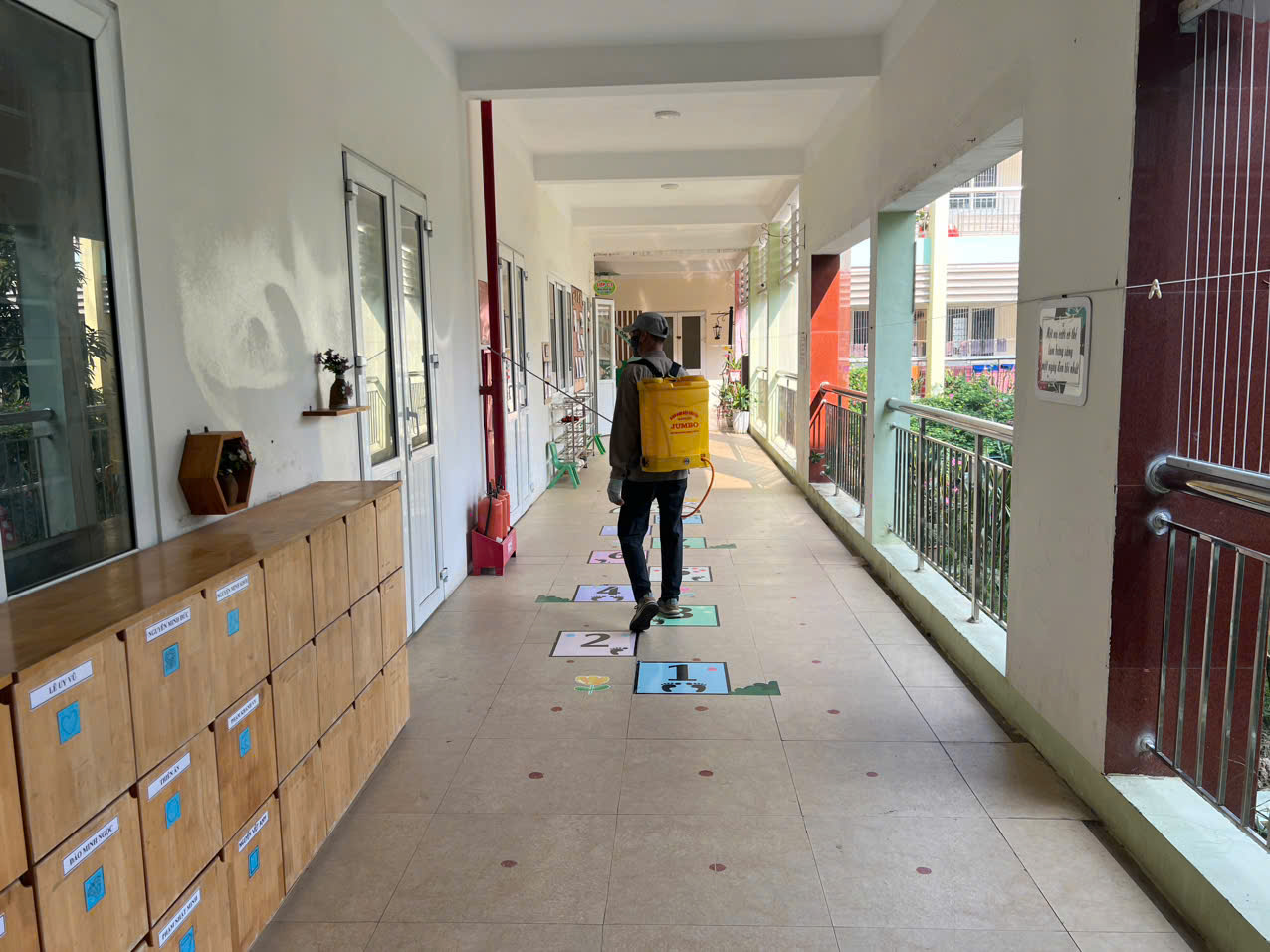 Để chủ động trong công tác phòng chống các loại dịch bệnh đặc biệt là dịch bệnh sốt xuất huyết tại Trường mầm non Ngô Thì Nhậm. Chủ nhật (ngày 10/11/2024) nhà trường đã tổ chức phun thuốc muỗi toàn bộ các khu vực trong trường bao gồm: 20 lớp học, nhà bếp, các phòng chức năng, các khu vực sân vườn. Sau khi đảm bảo thời gian tiêu diệt muỗi, đội ngũ giáo viên, nhân viên nhà trường đã tranh thủ ngày nghỉ đến trường để tiến hành tổng vệ sinh tất cả các khu vực trong và ngoài lớp học đảm bảo một không gian xanh – sạch – thoáng - an toàn cho trẻ. Đây chính là một nội dung quan trọng trong trong công tác chăm sóc sức khỏe cho học sinh nói chung và công tác phòng chống dịch bệnh nói riêng, giúp tạo ra một môi trường an toàn cho trẻ, giảm thiểu nguy cơ mắc bệnh do muỗi truyền dặc biệt là bệnh sốt xuất huyết. Dưới đây là một số hình ảnh về công tác phun thuốc muỗi, tổng vệ sinh môi trường của nhà trường: